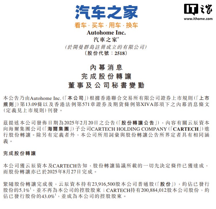 如此前公告所述,海尔集团通过旗下卡泰驰控股以总价约 18 亿美元(IT之家注:现汇率约合 128.83 亿元人民币)收购中国平安旗下云辰资本持有的汽车之家约 43.0% 的股份,成为汽车之家控股股东。